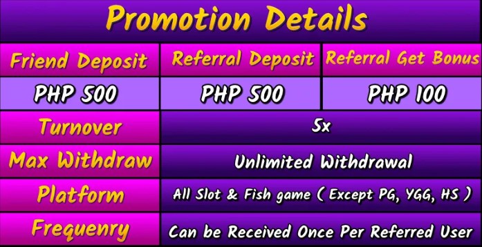 Referring player friends must make their first deposit of at least 500 PHP within one bill.