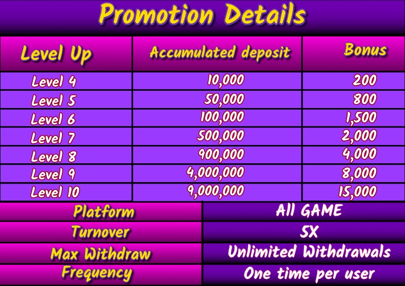 Before the player receives the level upgrade bonus. Players must have a total bet amount of 3 times their deposit. (Example of calculating the bet amount to upgrade to LV4: 10,000 x 3 = 30,000 bet amount.)
