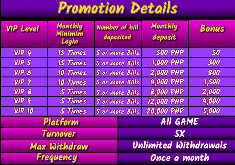 For Level VIP Up bonus: A player’s level remains the same even if the player has no deposit history in the past month.