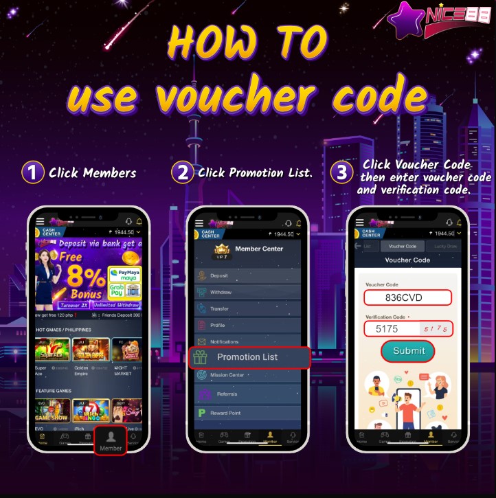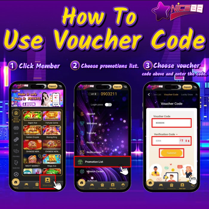 and then select the menu Promotion Code << then enter the code in the voucher code field and wait to receive the bonus.